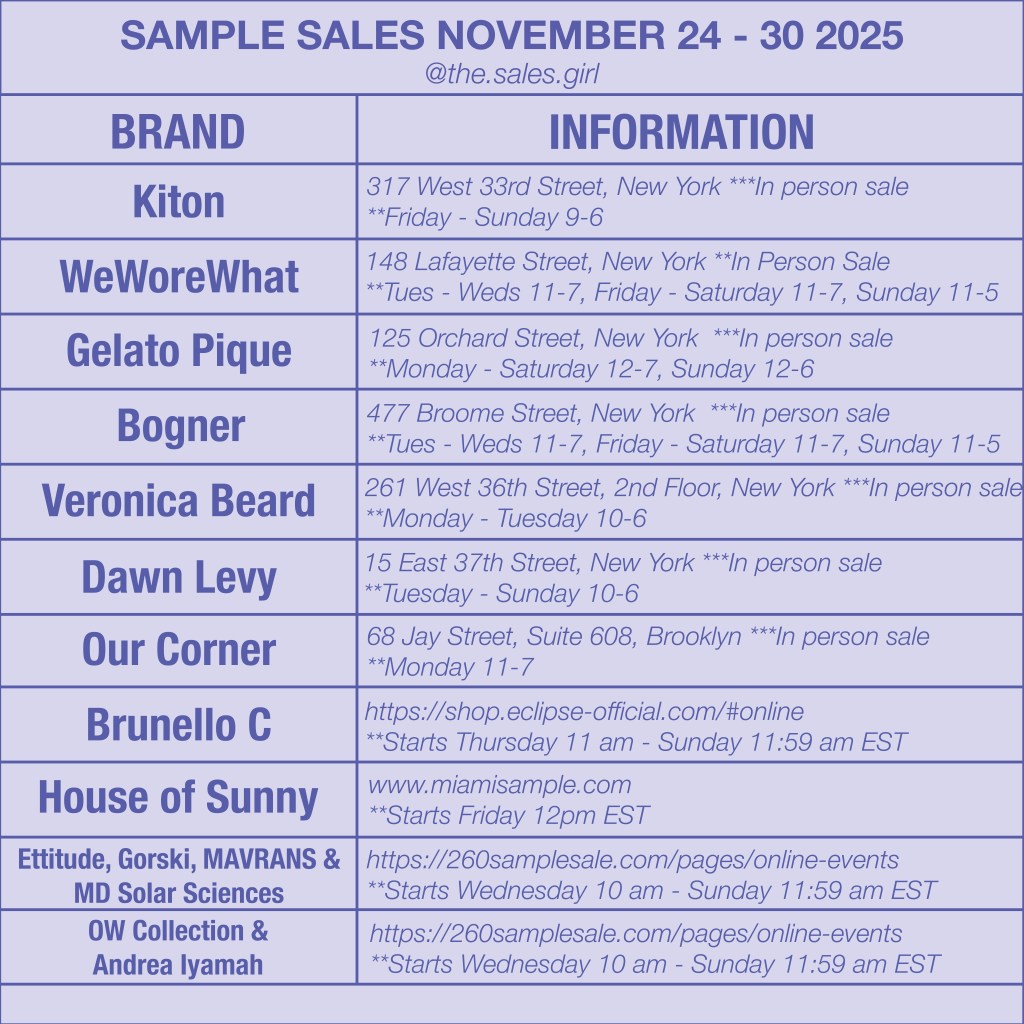 Hi, lovers of luxury deals! It’s The Sales Girl coming through with your sample sale cheat sheet for the week of November 24–30, 2025 — and let me tell you, it is stacked for Thanksgiving week. From cashmere dreams to cult-favorite loungewear, plus some major online drops, this week is bringing the heat.