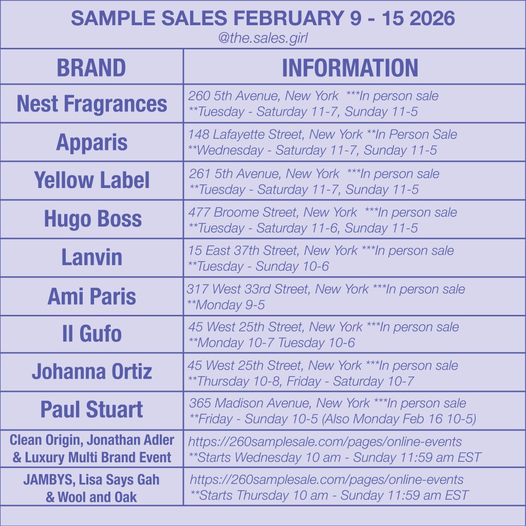 If you’re planning your shopping week, here is your curated NYC Sample Sale Guide for February 9–15. This week brings a strong mix of designer ready-to-wear, footwear, fragrance, outerwear, and several multi-brand showroom events — plus online sample sale launches.