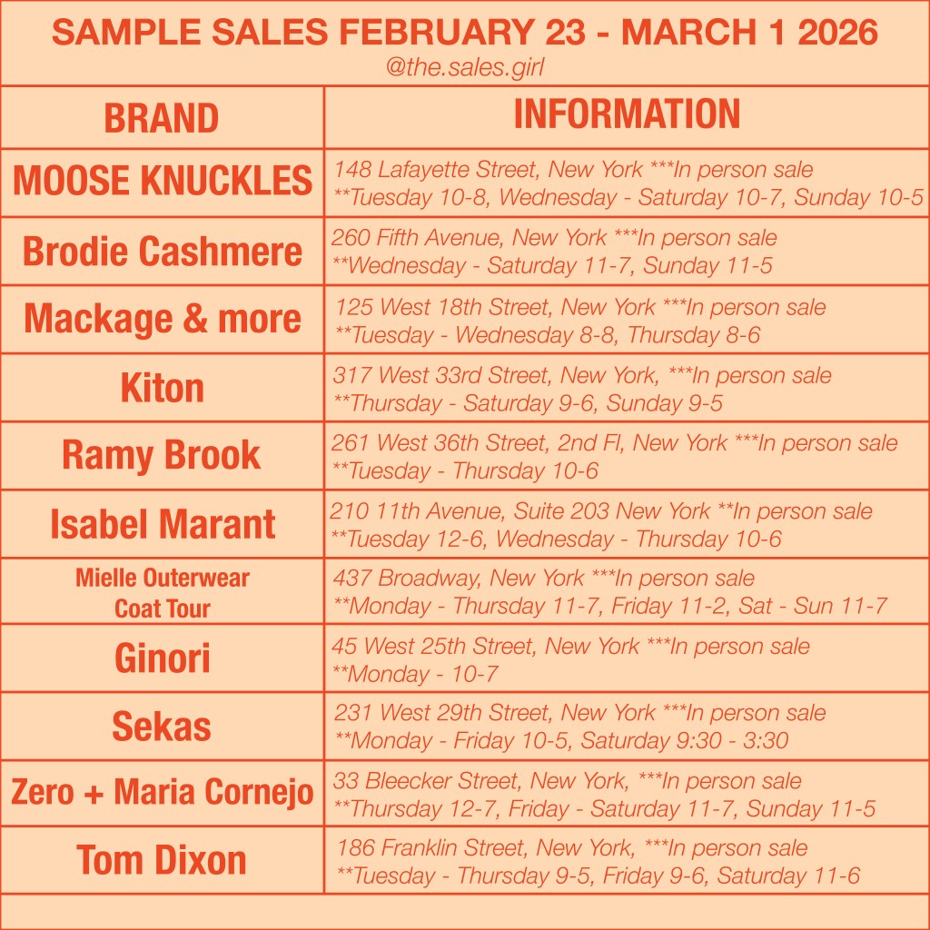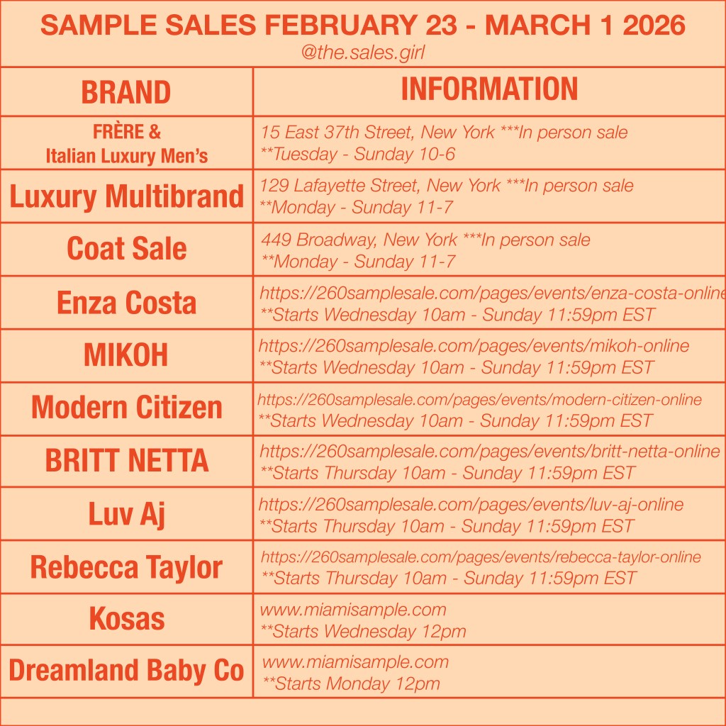 The NYC Sample Sale lineup for February 23 through March 1 includes luxury multibrand events, major outerwear sales, Italian menswear, contemporary designer labels, and a wave of online launches starting midweek.