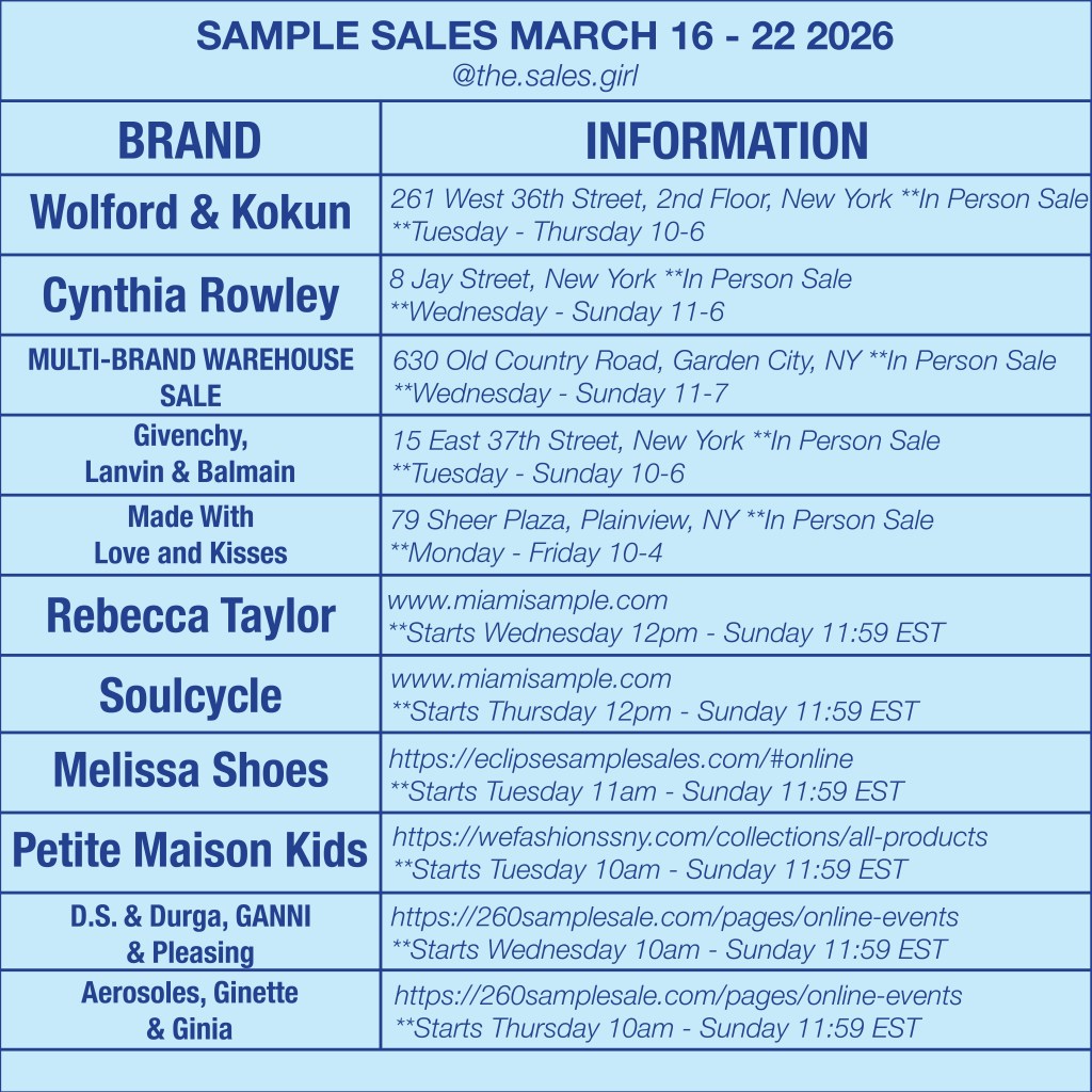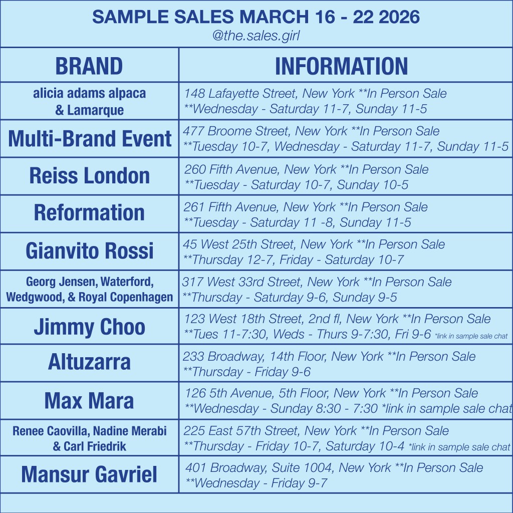 For real time calendars, early access insights, and on the ground reporting from inside the sales, follow @the.sales.girl — one of the most consistent chroniclers of New York’s evolving sample sale landscape.