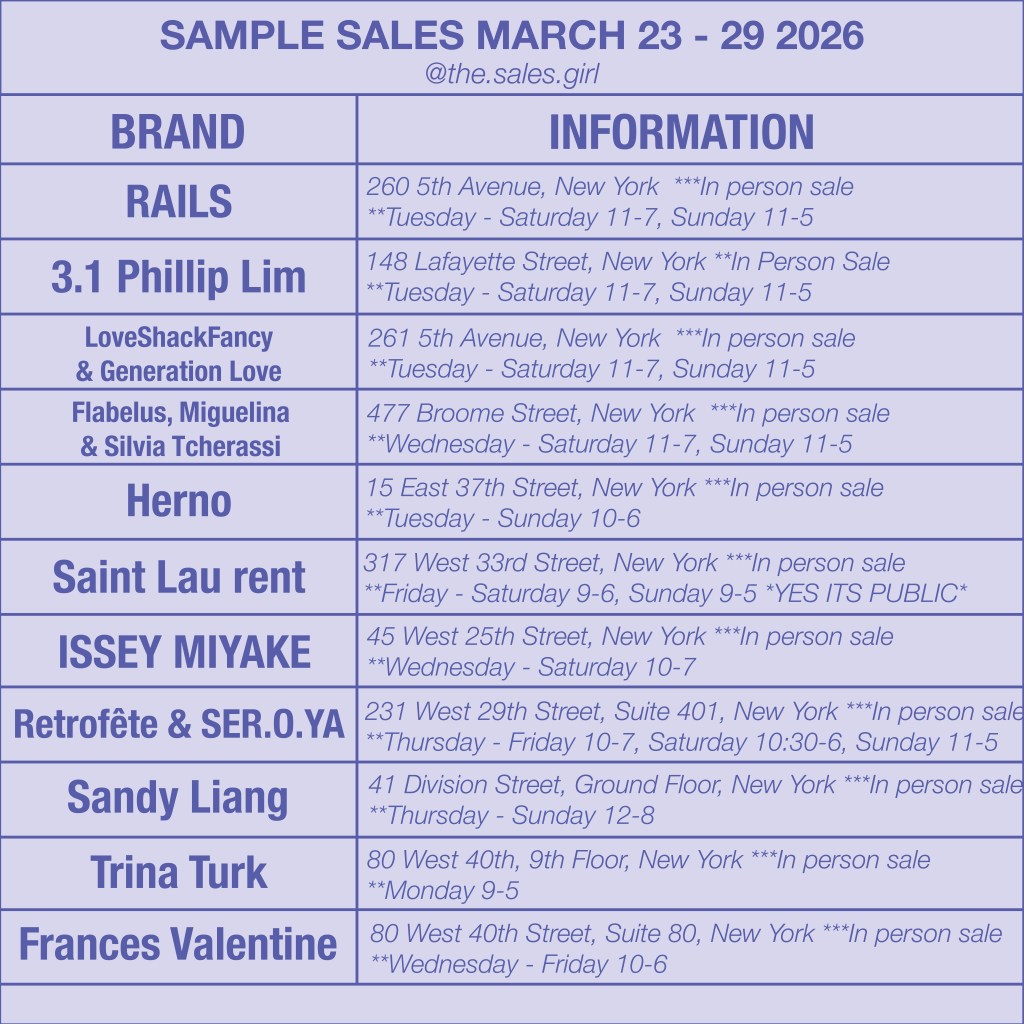 New York’s sample sale circuit is especially good this week. From downtown fashion favorites to major luxury names and under-the-radar finds, the March 23 to 29, 2026 lineup is packed with the kind of sales that make planning ahead worth it.