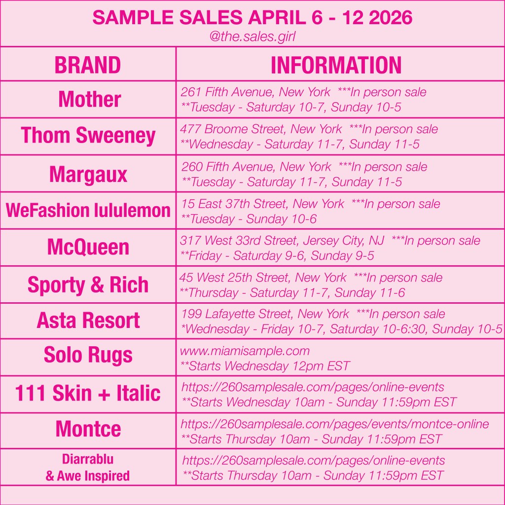 For more weekly sample sale roundups, early access updates, and the best sales worth visiting, follow @the.sales.girl.
